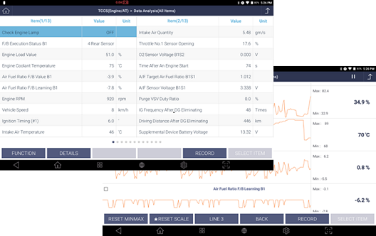 Diagnostic data can be recorded on the road test while the car is running the real driving condition. And recorded data (Flight Record) can be replayed both on G-scan or the larger PC screen. Also, these data can be displayed in graphical waveforms.