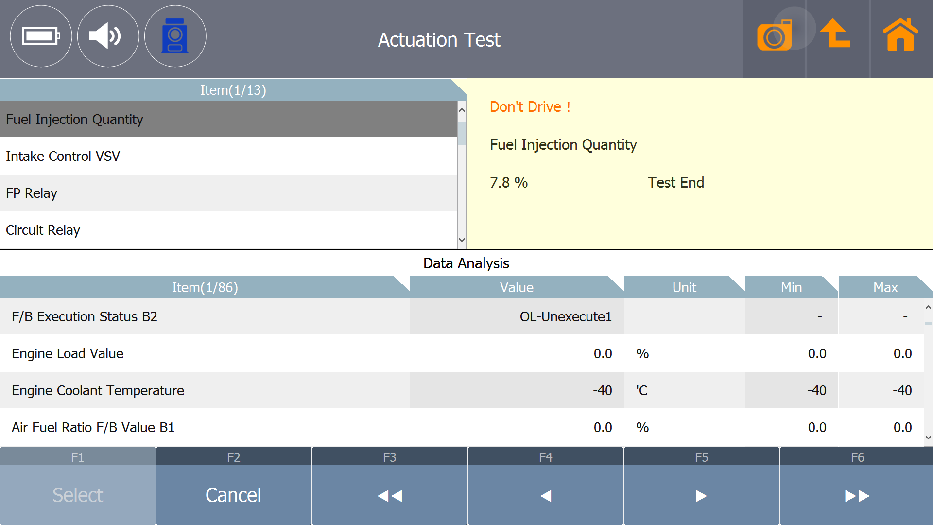 Actuation test is another basic diagnostic functions that G-scan Tab provides. Users can check the control unit's operation by activating or deactivating the operation of an active component under control unit's command.