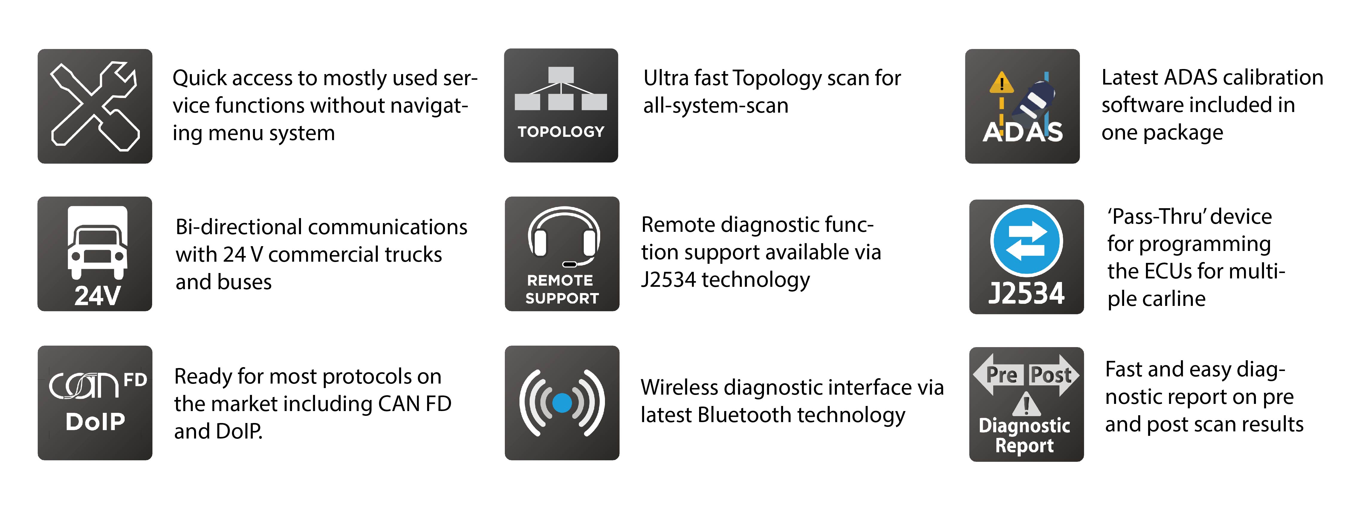 Zenith also offers ultra fast Topology scan function that scans all the vehicle systems, reports fault codes, and provides access to advanced diagnostic functions in each detected system.